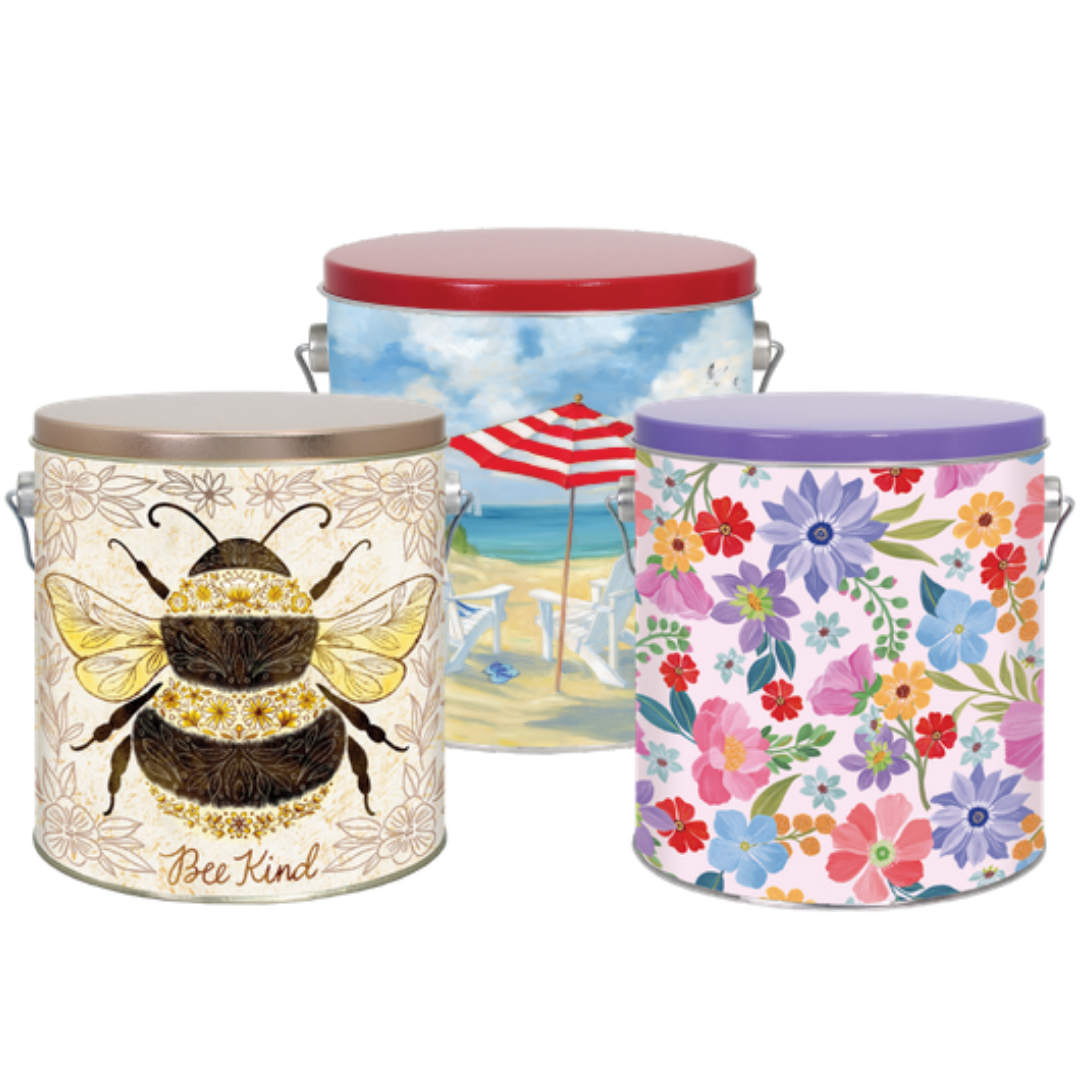 Our 1 gallon cans are hand packed with fresh popcorn that’s made to order. This is a single can that our customers can purchase as a delicious reminder of a past visit to the beach or as a gift for a family members or friends.