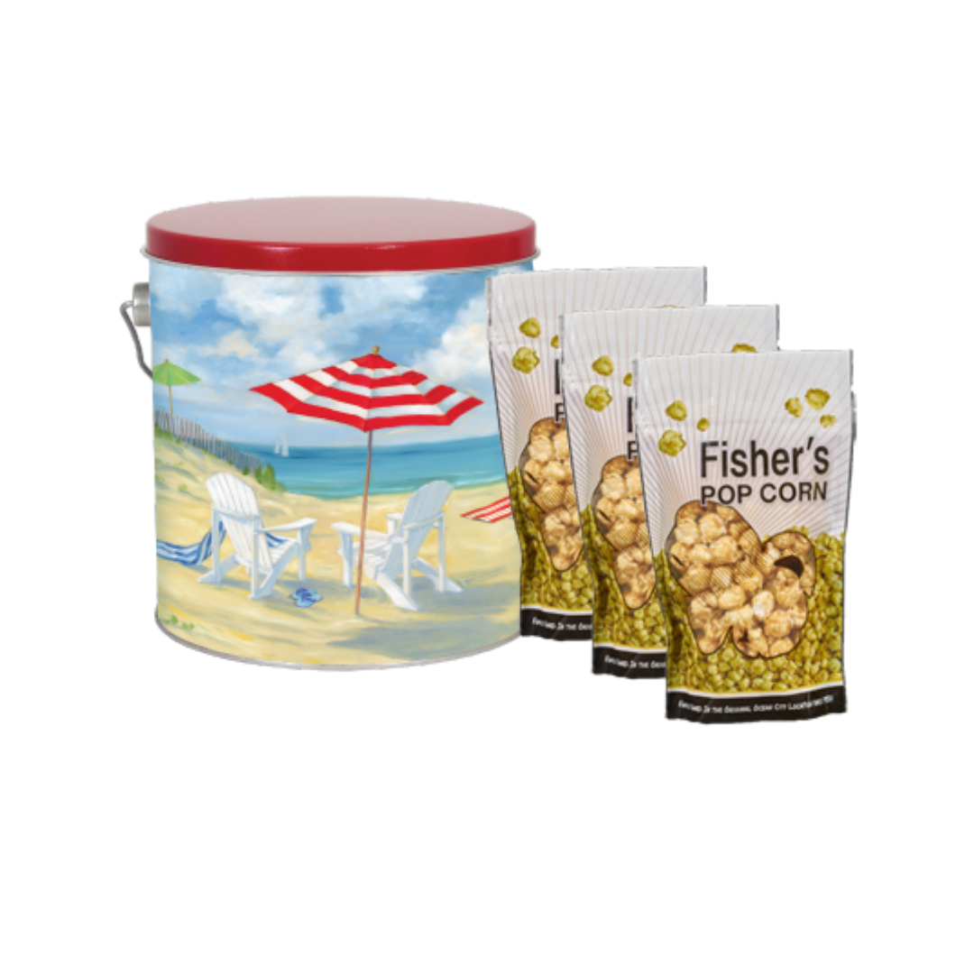 Our 1 gallon cans are hand packed with fresh popcorn that’s made to order. This is a single can that our customers can purchase as a delicious reminder of a past visit to the beach or as a gift for a family members or friends.